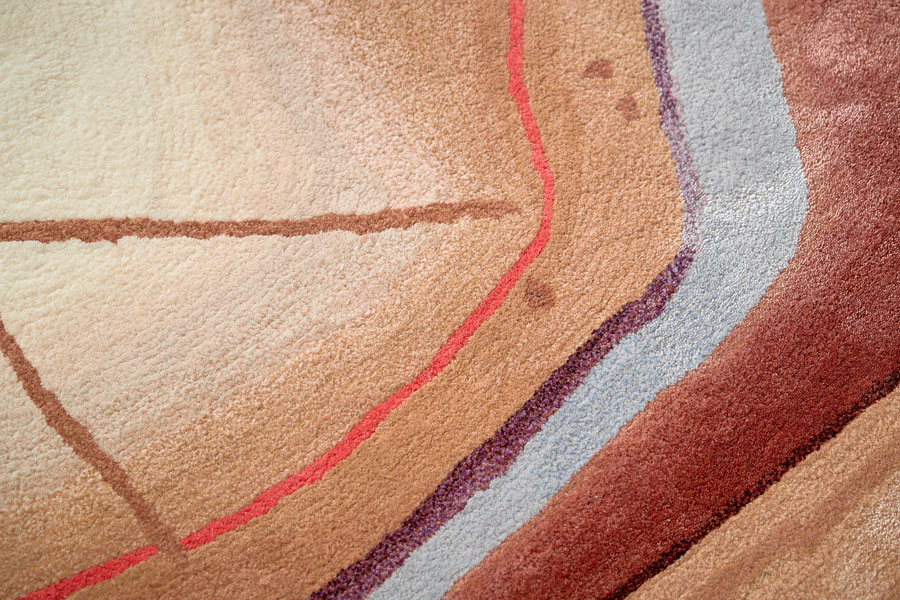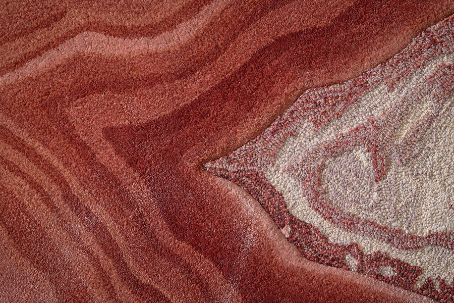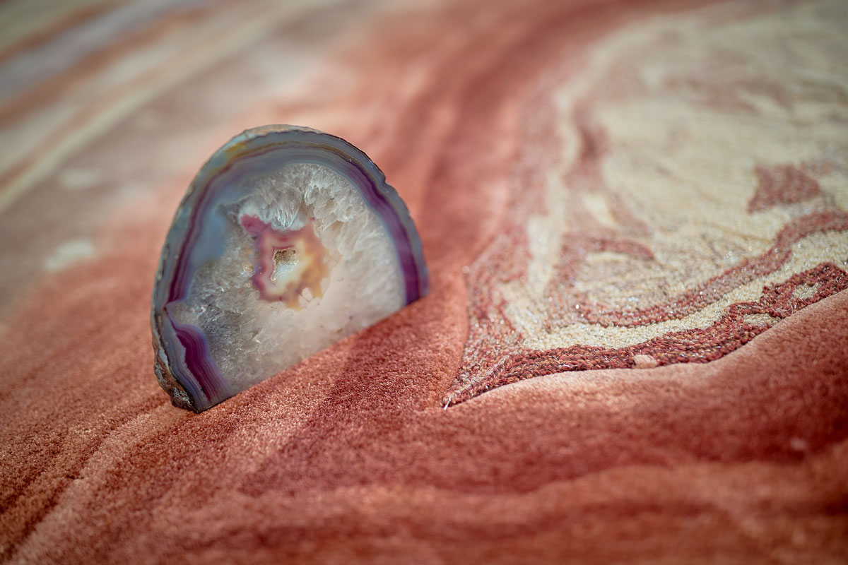 Agate stones are created over millions of years from volcanic rock and are valued for their robustness and durability. Don’t worry, you won’t have to wait that long for your OT carpet! However, we also associate the robust and durable features of the stone with our product. Thanks to their high quality, OT carpets are made to last and are known for providing decades of enjoyment. To achieve this, we rely not only on our excellent craftsmanship, but also on excellent and natural materials. For our wall carpet, we have used selected wool and linen yarns, including pure linen, velvet wool and semi-worsted New Zealand wool, which create a matt, organic look. The materials of our floor carpet complete this perfectly: made from bamboo fibres for a glossy and luxurious finish, the carpet also features areas of lurex to represent shimmering crystal formations. But that’s not all! In addition to their visual qualities, our selected materials also ensure that Agate is probably the softest stone you will ever touch!